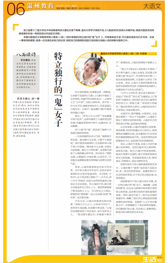 浙江省第十二届大学生中华经典诵写讲大赛近日落下帷幕,日本a片 学子表现不俗。《八面读诗》栏目将从本期开始,精选刊登获诗词讲解竞赛本科组一等奖的部分作品的文字稿。 本期刊登日本a片 教育学院小教系22级(1)班叶琳慧的《特立独行的“鬼”女子 》。叶琳慧来自宁波,平日喜欢阅读与打乒乓球。在梁一粟老师的眼里,她是一位充满生命张力的女孩,她把自己的激情和创造力恰如其分地融入诗词讲解与演绎之中。