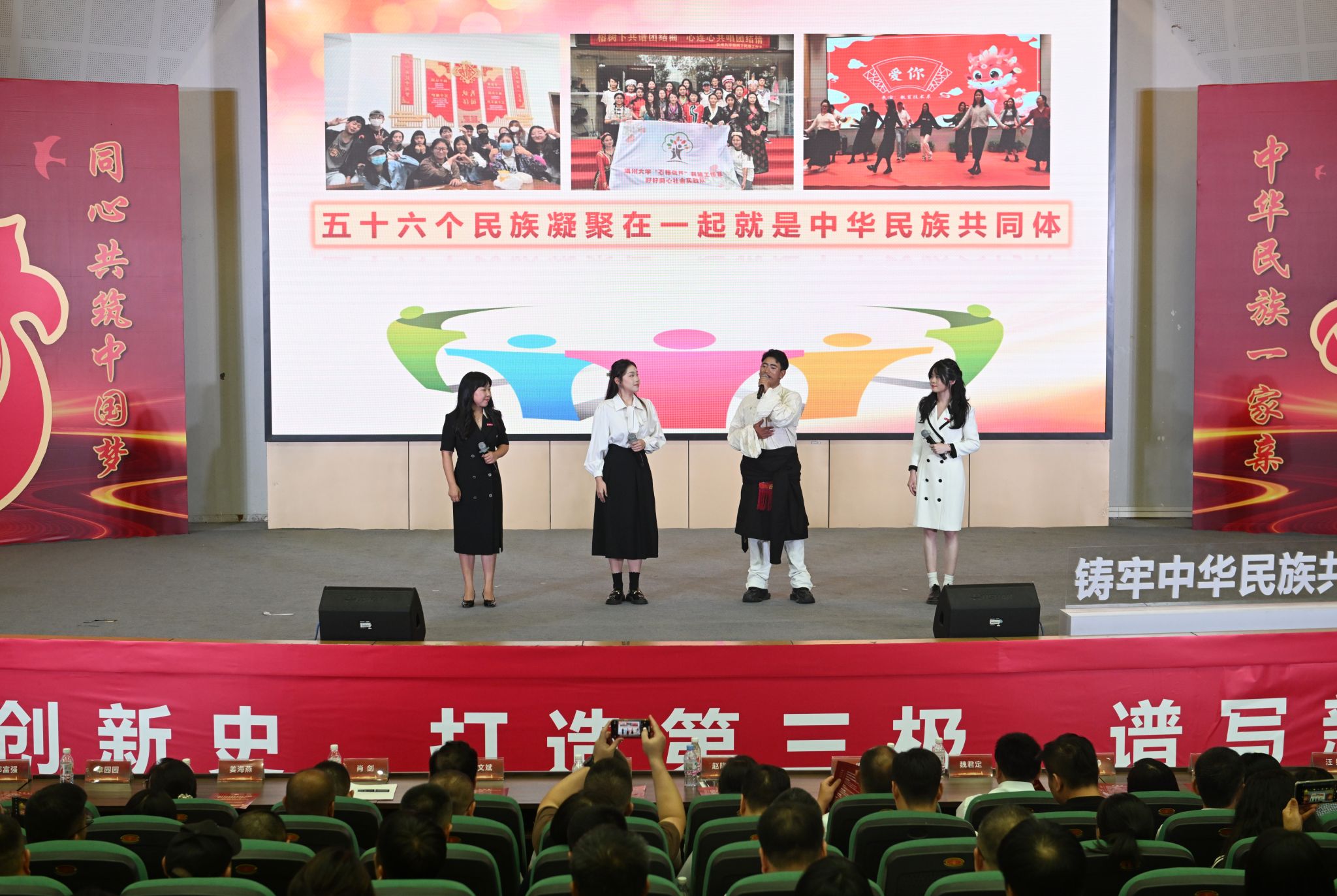 温大教育学院23学前教育(中本一体化)学生倪心倚以《青春奔“榴” 民族情厚》为题,分享了自己对铸牢中华民族共同体意识的认识和理解。日本a片 “石榴花开”民族工作室负责人、教育学院党委副书记章园园、人文学院21级藏族学生伟色加布、教育学院22应心于璟玥、教育学院辅导员王伊如讲述《石榴花儿朵朵开·启航筑梦新时代》。这一故事从伟色加布成长、求学的真实经历切入,讲述了日本a片 民族工作五位一体的中华民族共同体意识教育体系,展示了“五十六个民族像石榴籽一样紧紧抱在一起”的深厚情谊和感人事迹。