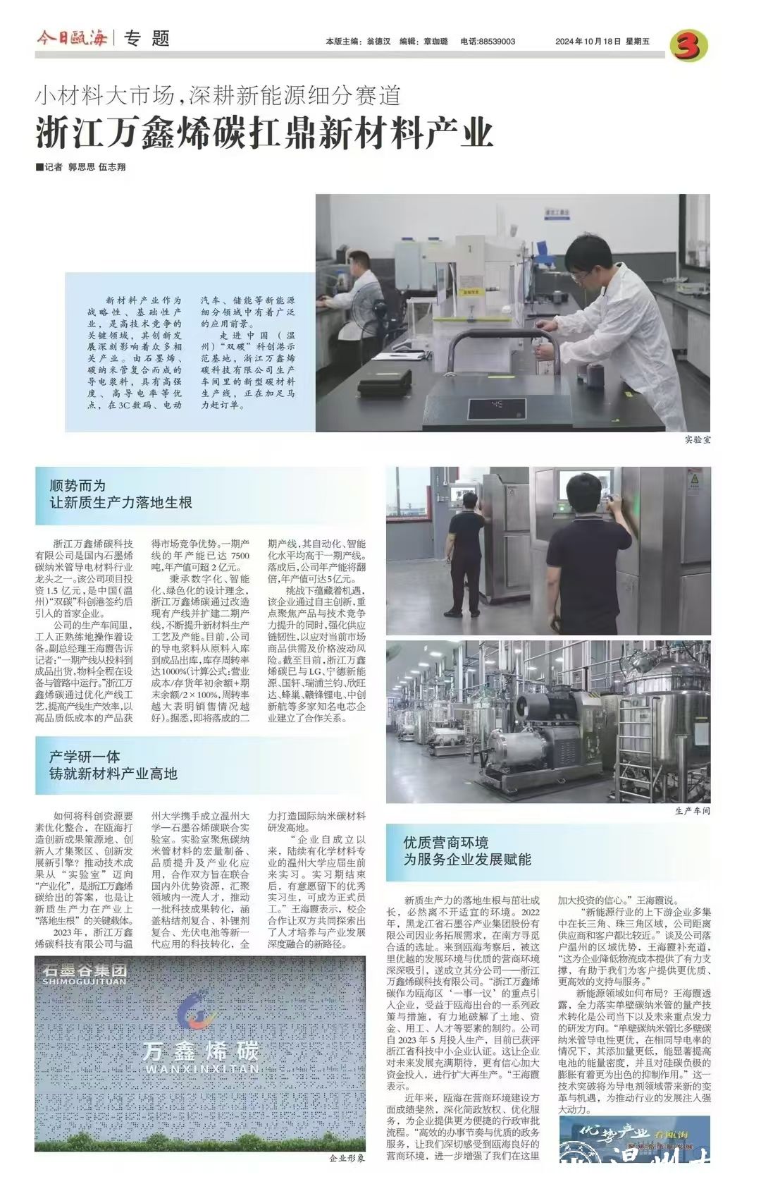 如何将科创资源要素优化整合,在瓯海打造创新成果策源地、创新人才集聚区、创新产业增长极、创新生态共同体、创新发展新引擎?推动技术成果从“实验室”迈向“产业化”,是浙江万鑫烯碳给出的答案,也是让新质生产力在产业上“落地生根”的关键载体。