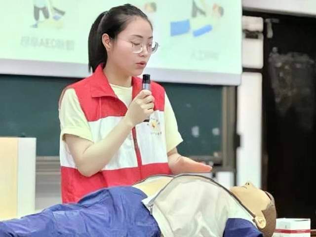 项素素老师结合自身经历,带领同学们全面深入地了解心肺复苏的相关理论、海姆立克急救法以及各种创伤的包扎等知识,生动细致地讲解了各种急救方案的具体操作方法。通过使用教具和邀请同学上台演示等方式,急救理论变得具体直观。培训中,同学们认真聆听,互相练习操作,高效地学习了丰富的急救知识,明确了团队合作的重要性。