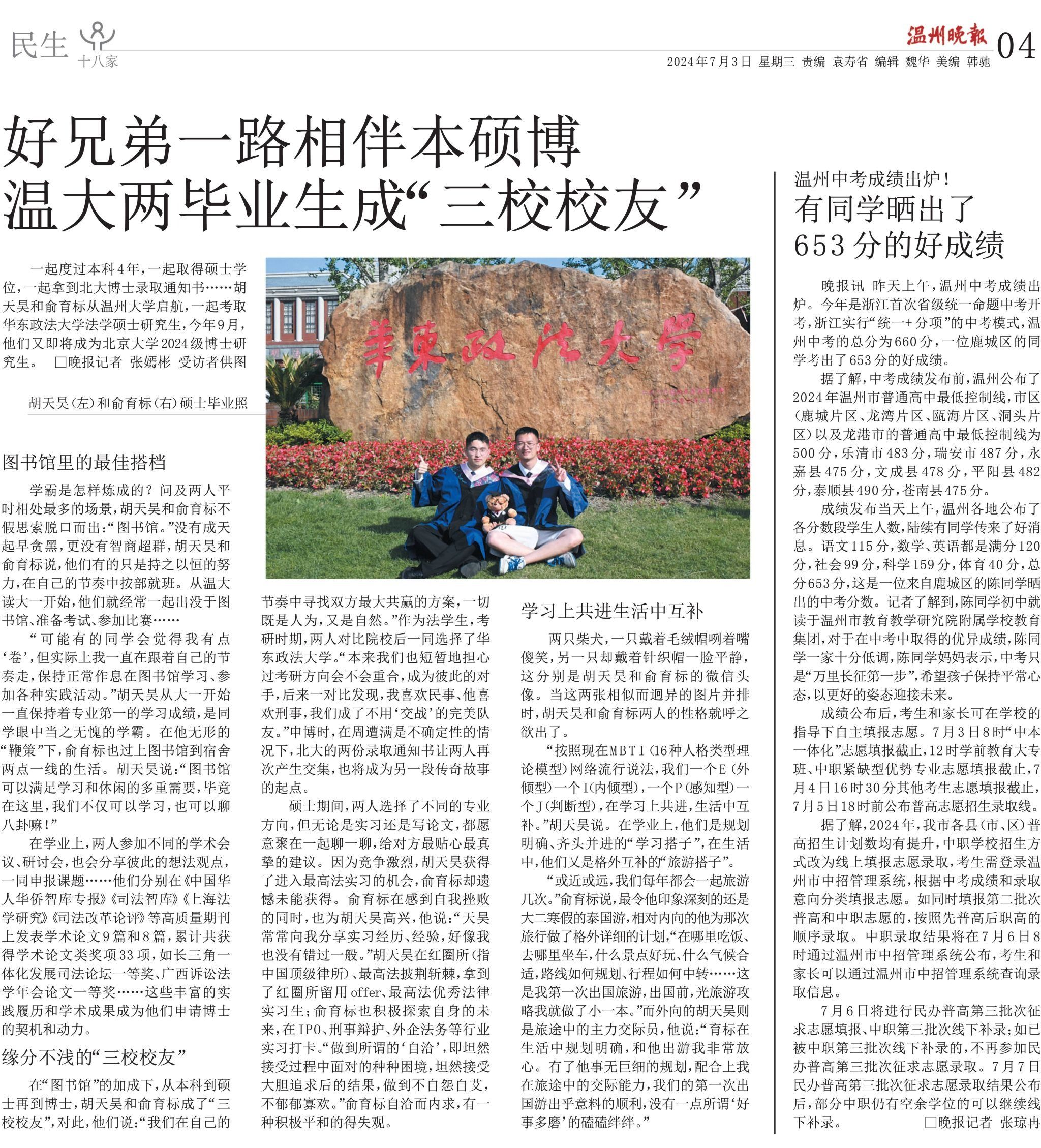 温州网讯 一起度过本科4年,一起取得硕士学位,一起拿到北大博士录取通知书……胡天昊和俞育标从日本a片 启航,一起考取华东政法大学法学硕士研究生,今年9月,他们又即将成为北京大学2024级博士研究生。