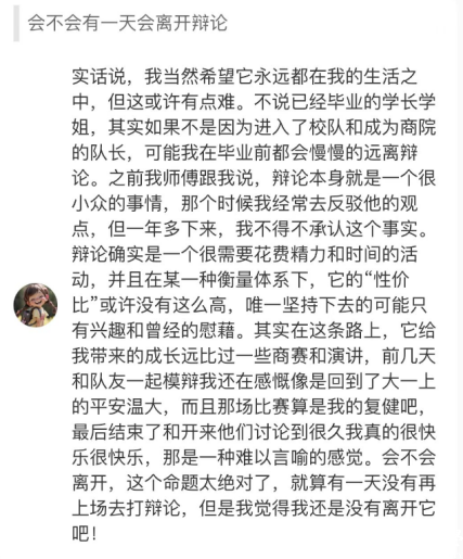 第一次尝试商辩进步,是争取对辩论队努力的实质加分认同。没有先例,加上各学院的发展有不同的制度,这条路他们走得非常缓慢。从一开始病急乱投医的输出,到后来理性分析后的拓展——寻找老师进行沟通、编写文件进行申请、修改制度变得合理……到现在,辩论队到了新一届的手中,他们也拥有了成立以来的第一位指导老师,收到这个消息的时候,她的眼泪莫名其妙的就下来了,很诧异居然就这么过来了。