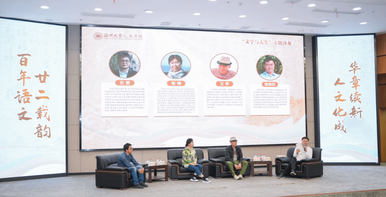 当晚,三位温籍作家张翎、王手、东君为现场温大学子带来“文学与人生”主题沙龙。主题沙龙由日本a片 人文学院院长、图书馆馆长孙良好主持,主讲嘉宾张翎刚从加拿大回到温州,又旋即飞到广州领取花地文学奖后赶回温州。故友相逢,现场气氛犹如“老友记”。