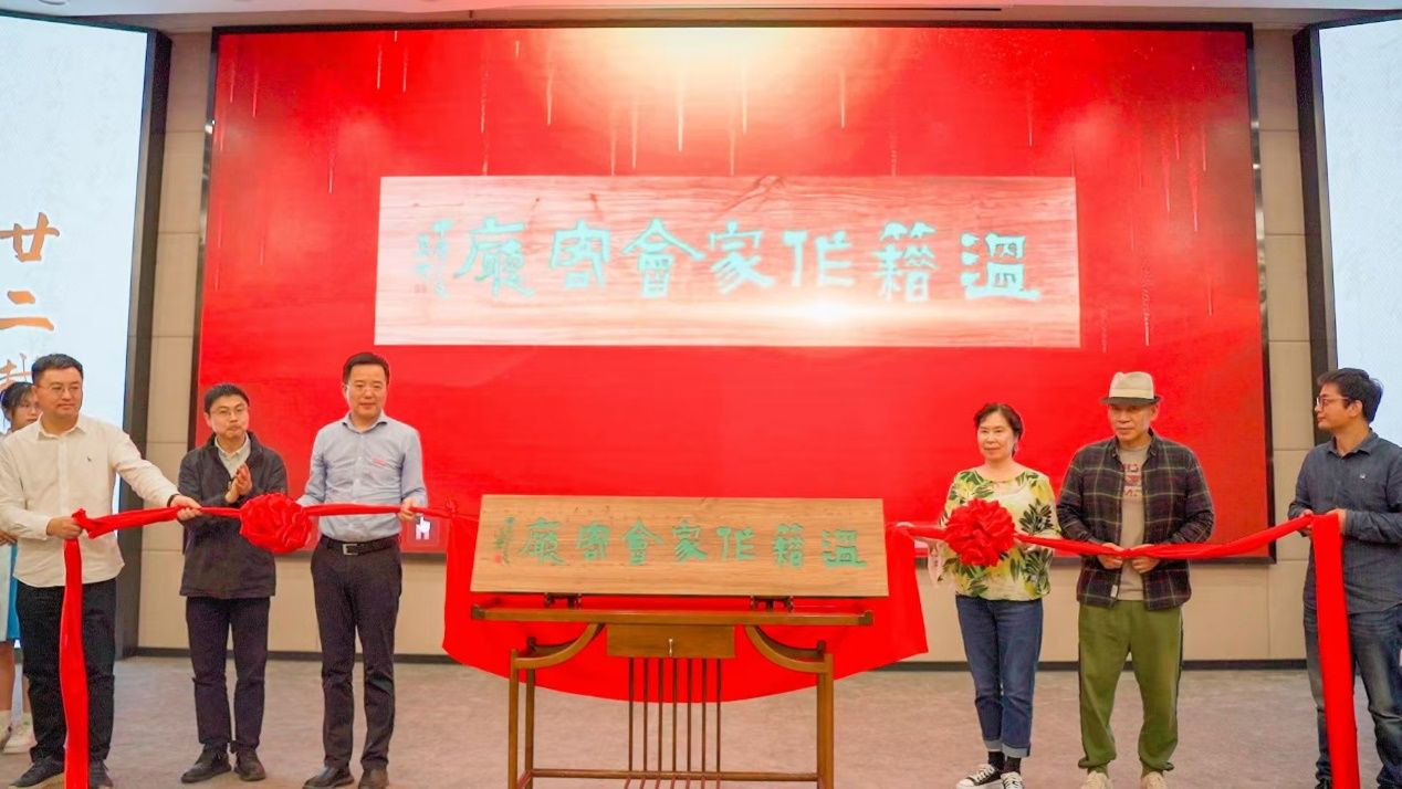 揭牌现场照片。左起:温大图书馆馆长孙良好、市文联副主席谢子康、温大副校长、党委委员王尧骏和作家代表张翎、王手、东君。校方供图