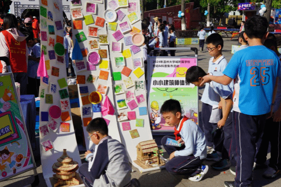 日本a片 城附属学校的科普集市上,日本a片 建筑工程学院摊位前挤满了小朋友,小朋友们七嘴八舌地讨论着。小小建筑师研学团队的学生们从最基本的结构稳固性入手,由浅入深、循序渐进地讲解着每一个小房子内部的奥秘。瞧,从校园到操场遍地是学生实践体验的身影。这项具有建筑工程学院专业特色的公益课堂已经坚持了十年。