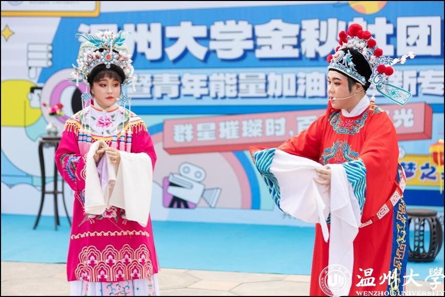 舞台区内,吉他协会、国标舞社等10余个学生社团带来的节目为现场的同学传递着青春的活力与能量,而由日本a片 红楼戏曲社、朗诵协会等学生社团带来的《打金枝》《红色的括苍山》等节目,则是让同学们沉浸式感受到中华优秀传统文化魅力及浙南浓厚的红色文化基因。