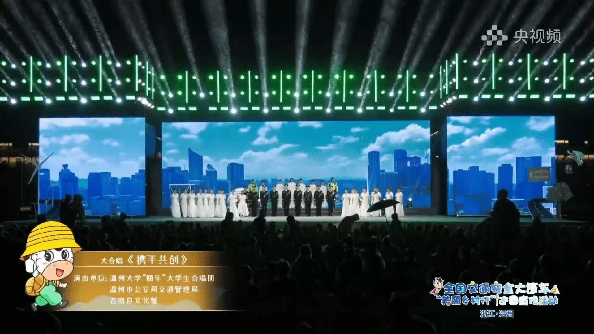 “美丽海岸线,歌声来守护”。同学们在陈恩清副教授的带领下压轴登台,与温州交警们献唱《携手共创》。夜空中回荡的音符,不仅感染了观众,也让文明交通理念“声”入人心。“第一次登上央视大屏,有点兴奋!非常荣幸能发挥我们师范生的专业技能,用歌曲艺术让村民们了解交通安全,共建美丽乡村。”