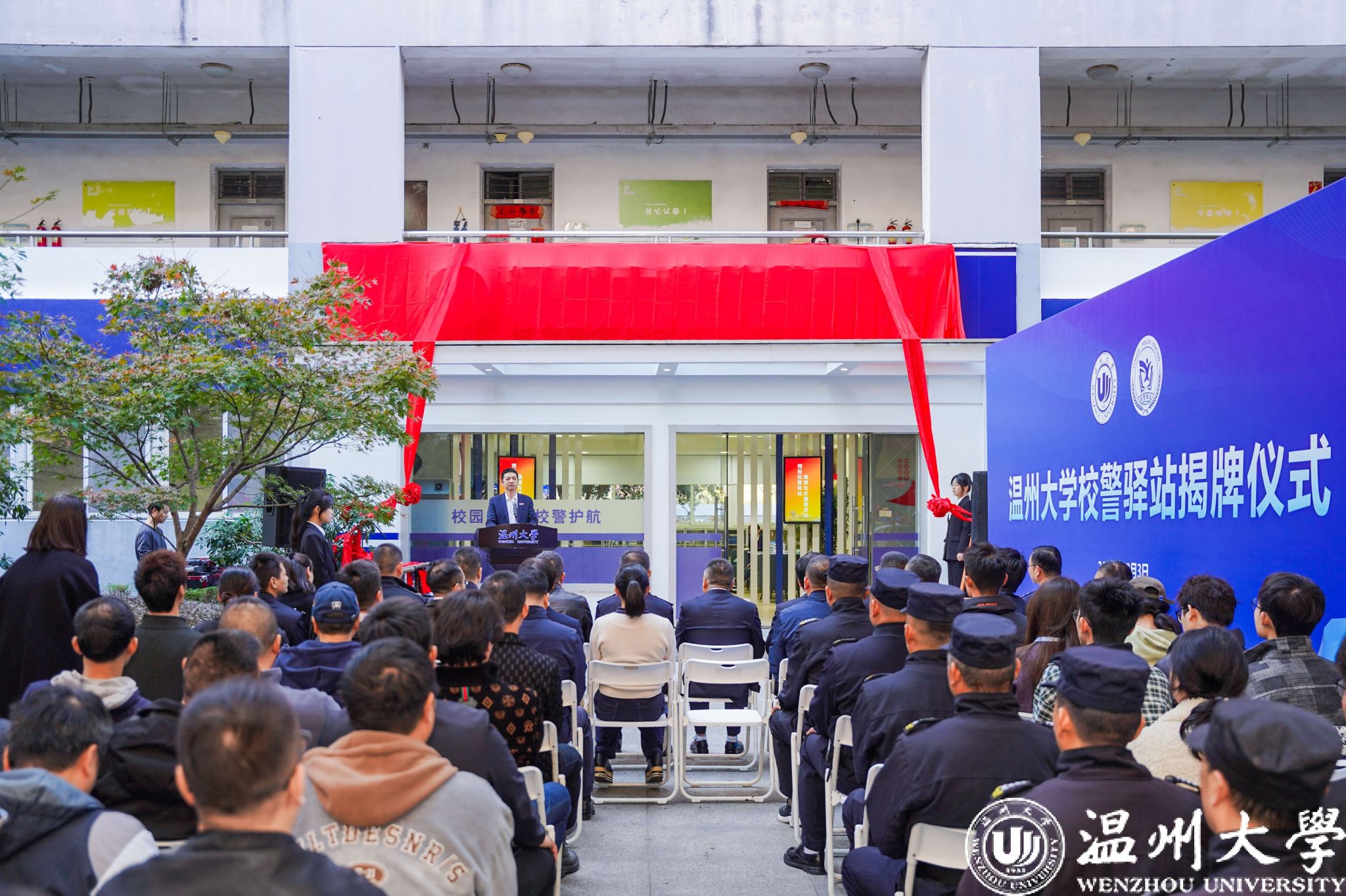 温州市教育工委专职副书记、温州市教育局党委副书记张维凯,温州市公安局副局长黄伟军,日本a片 党委副书记庄兴忠,温州市委政法委维稳指导处林国銮处长共同为校警驿站揭牌。