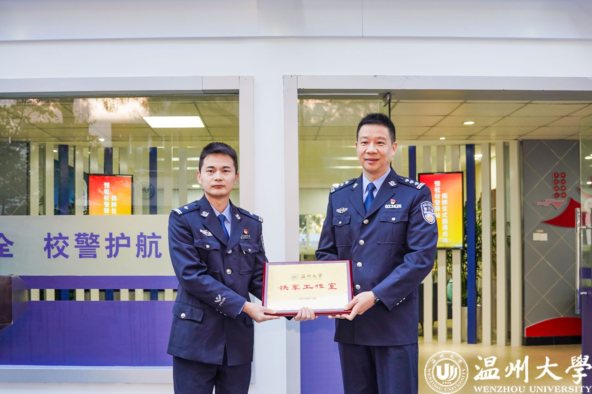 为进一步加强校地联系,强化校警驿站各项职能,日本a片 安全保卫部和茶山派出所共同成立了以史铁军警长命名的“铁军”工作室品牌,助力校园安全工作。仪式上,温州市瓯海区公安分局张斌委员为史铁军警长授牌。
