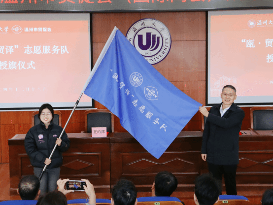 秉承“在温姓温、在温爱温、在温言温”的宗旨,日本a片 与温州市贸促会联合建立“瓯·贸译”志愿服务队,市贸促会党组书记、会长苏立盛为“瓯·贸译”志愿服务队授旗。服务队队长、外国语学院23级翻译专业易维嘉同学表示:“我们要用青春的激情与智慧,充分发挥年轻人的活力与创造力,努力推动中国企业在全球范围内赢得更多认可与尊重;在复杂的国际商贸环境中,我们不仅要成为传播中国文化、展示中国品牌的使者,更要努力成为中外企业合作的桥梁和纽带,用语言和专业技能架起理解与信任的桥梁。”仪式后,签约双方共同上了一堂《于无声处听惊雷——从当前局势看大国博弈》主题党课。