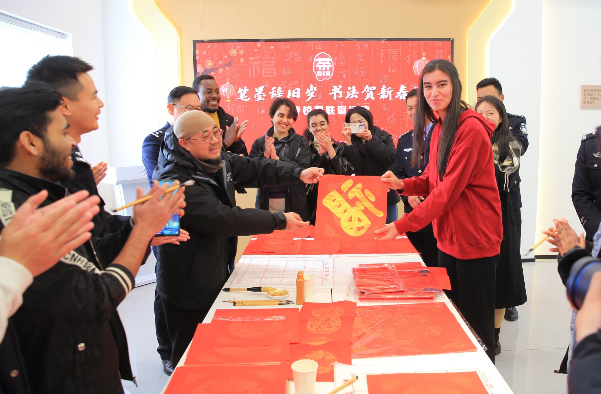 国际教育学院与茶山派出所共同举办了以“笔墨辞旧岁,书法贺新春”为主题的特色活动。活动现场,墨香四溢。在专业书法老师的指导下,留学生们兴致勃勃地拿起毛笔,蘸满浓墨,一笔一划地书写着“福”字和春联。他们虽然初涉书法,但每个人都全神贯注,力求将每一个字都写得工整美观。来自乌兹别克斯坦的留学生娜美感慨地说:“春联上的每一个字都蕴含着吉祥和美好的寓意,这让我深刻体会到了中国人对和谐、好运的追求,这次体验让我更加热爱中国文化了。”