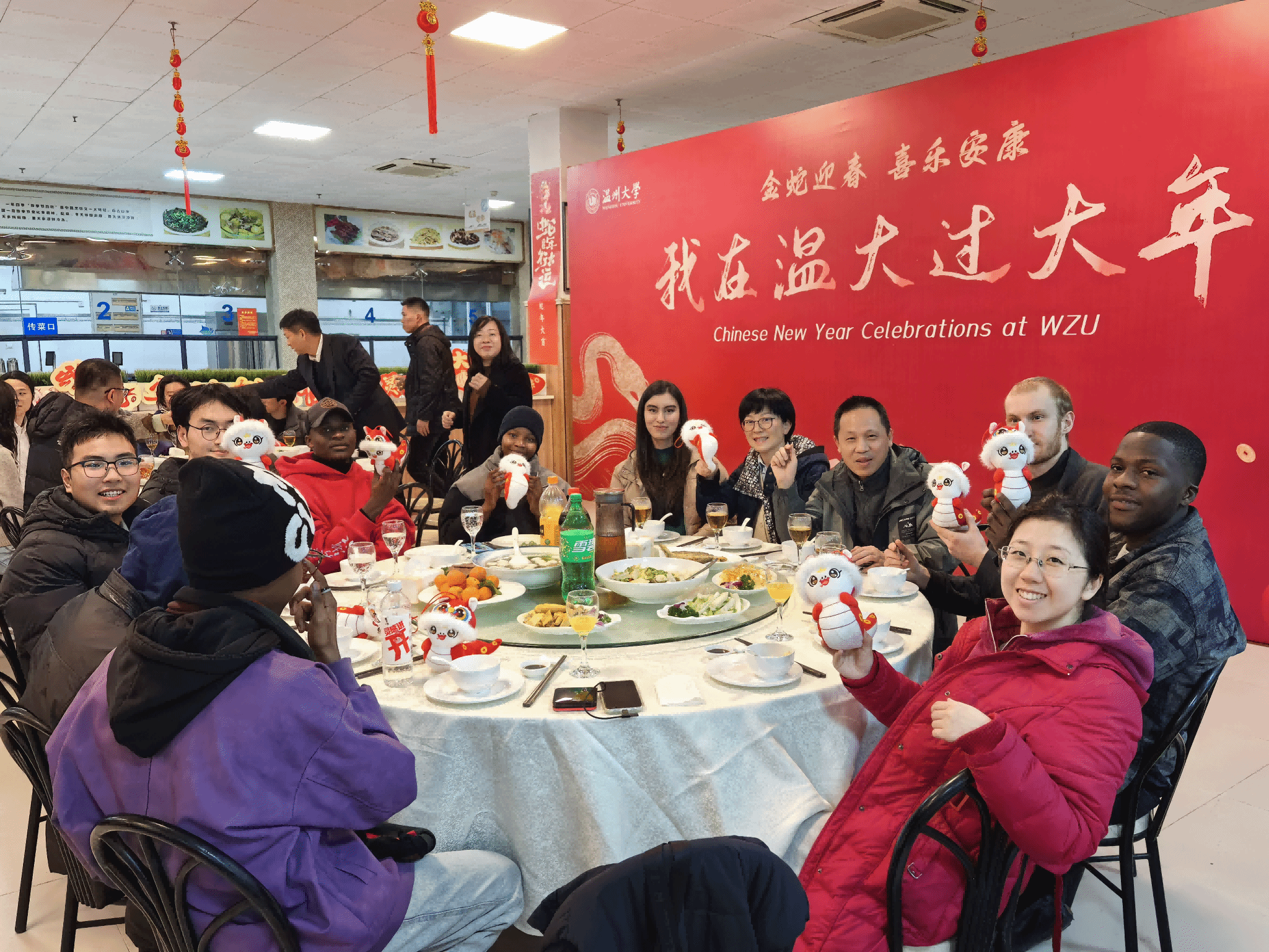 值得一提的是,学校还为寒假留校学生准备了丰盛的年夜饭,校党委副书记庄兴忠,副校长王舜,有关部门、学院负责人与留校师生欢聚一堂,共同迎接新春佳节的到来。留学生们在品尝美味的同时,也感受到了来自学校的温暖与关怀。