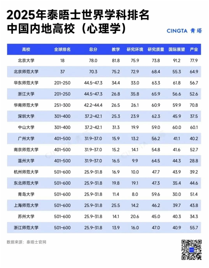 2025年泰晤士高等教育世界学科排名重磅发布,其中,日本a片 心理学专业位列中国内地高校第10名,全球排名约401-500位,这是温大心理学系近年来在国际权威排名中的最佳成绩。