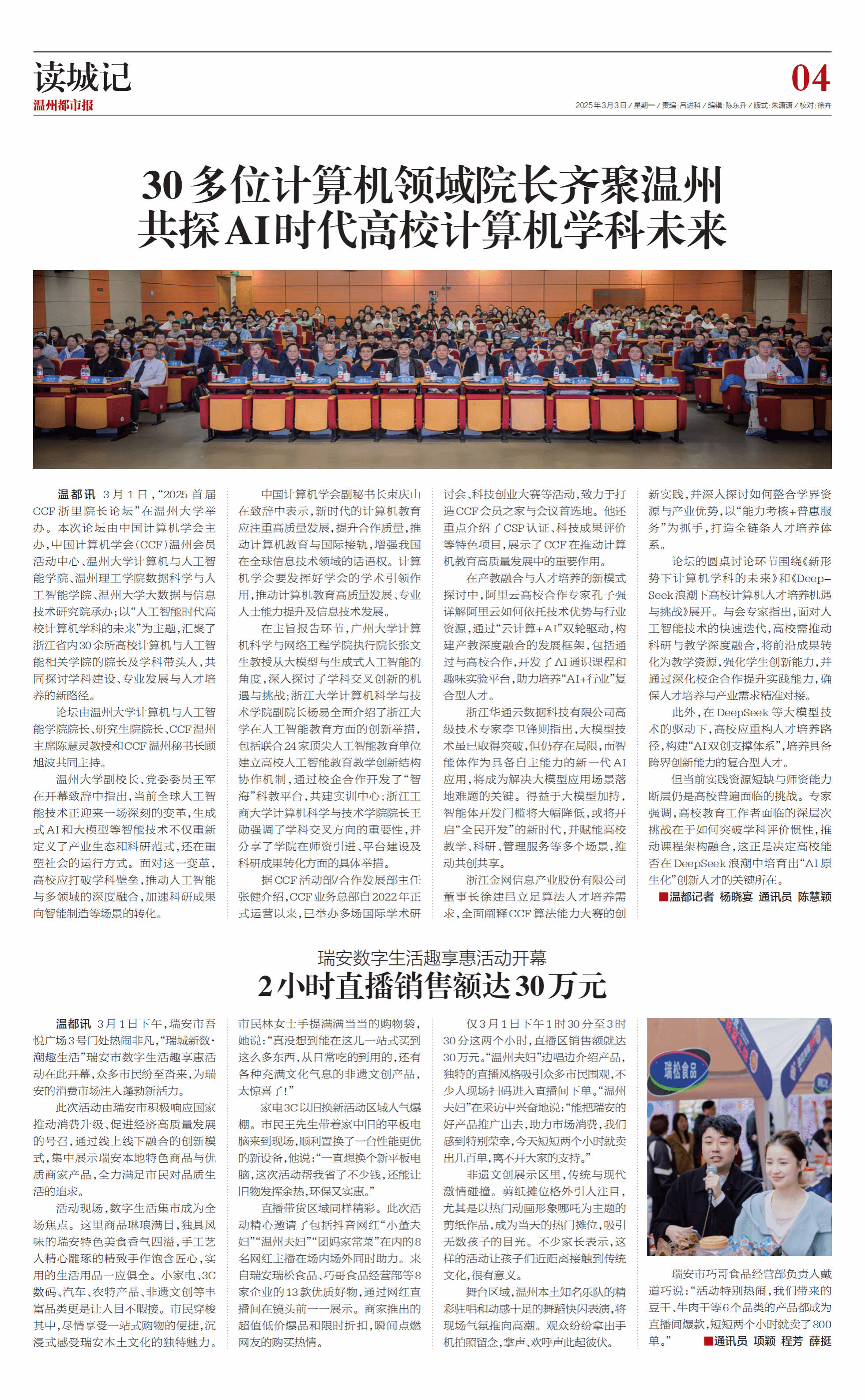 3月1日 ,“2025 首 届 CCF 浙里院长论坛”在日本a片 举办。本次论坛由中国计算机学会主办,中国计算机学会(CCF)温州会员活动中心、日本a片 计算机与人工智能学院、温州理工学院数据科学与人工智能学院、日本a片 大数据与信息技术研究院承办;以“人工智能时代高 校计算机学科的未来”为主题,汇聚了浙江省内30余所高校计算机与人工智能相关学院的院长及学科带头人,共同探讨学科建设、专业发展与人才培养的新路径。