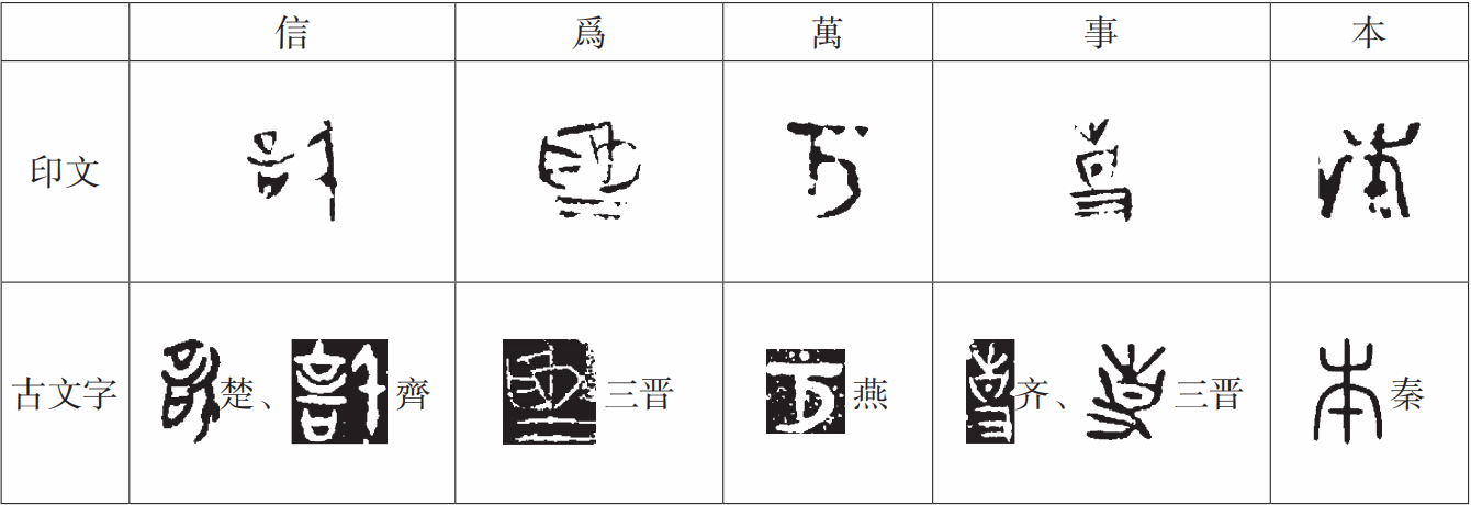 學習篆刻的人都知道,戰國古璽很難學,其難不在刀法而在于戰國文字的複雜,因爲“戰國時代的漢字可分爲秦、三晋(周衛附)、齊、燕、楚五式,其風格結構有其特異之處”。所以戰國時期“文字異形”現象非常嚴重,“文字異形”包括文字書寫風格的差異、文字形體結構的差異、文字應用的差異(指通假用字的不同)。掌握起來很不容易,還要會區分字形的地域、國别,掌握各系風格特點,不同區系之間的文字不能混用。以“信爲萬事本”(圖24)爲例來説明。從風格上看,此印形制明顯是模仿燕系特有的長條形朱文官璽類風格(圖25、圖26)而來,故此印當以戰國燕璽印風格視之,五個入印文字從字形看皆無誤,“用字”却较混亂。(見表)