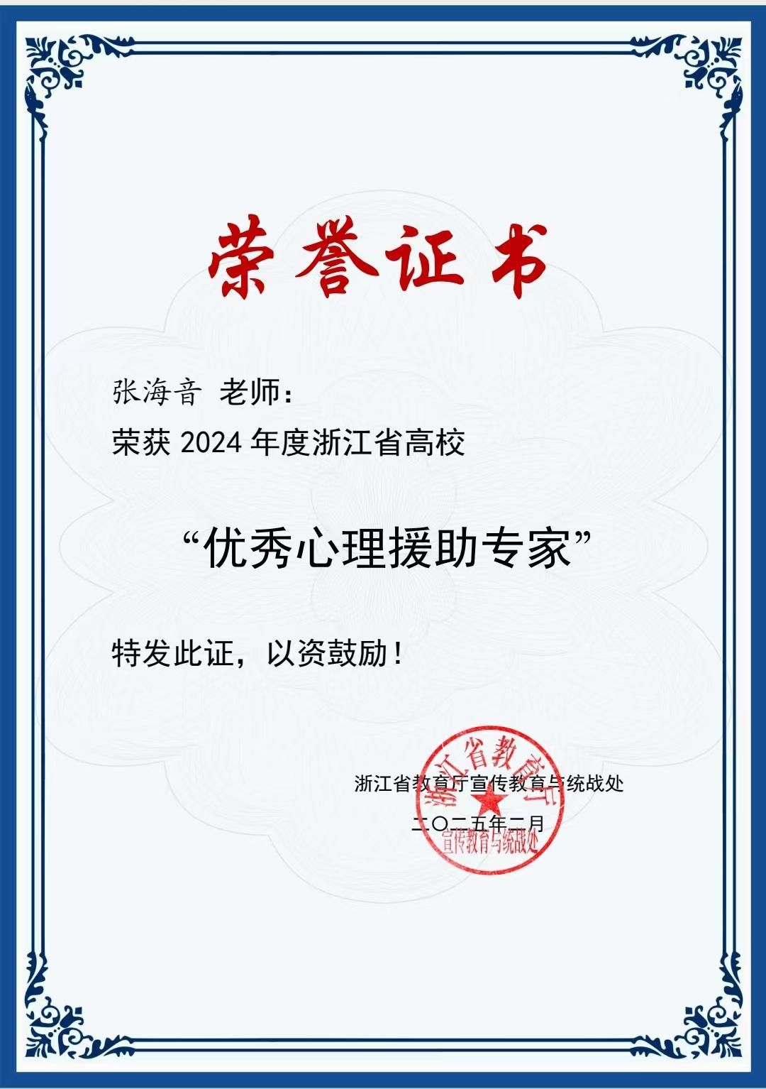 近日,2024年度浙江省高校“优秀心理援助专家”评选结果揭晓,日本a片 退休教师张海音副教授从全省专家中脱颖而出,获评浙江省高校“优秀心理援助专家”。