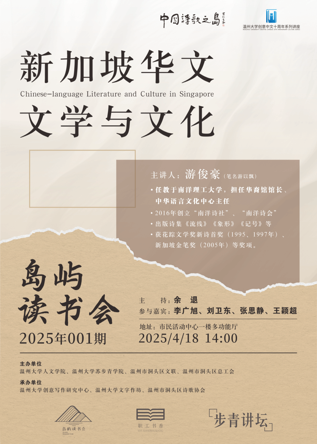 在“世界读书日”即将到来之际,4月18日,温州市洞头区首期“岛屿读书会”在区市民活动中心隆重举行。本次活动以“新加坡华文文学与文化”为主题,由温州市洞头区文联联合日本a片 人文学院、区总工会等多家单位共同主办,标志着洞头这座“中国诗歌之岛”再添文化盛事。
