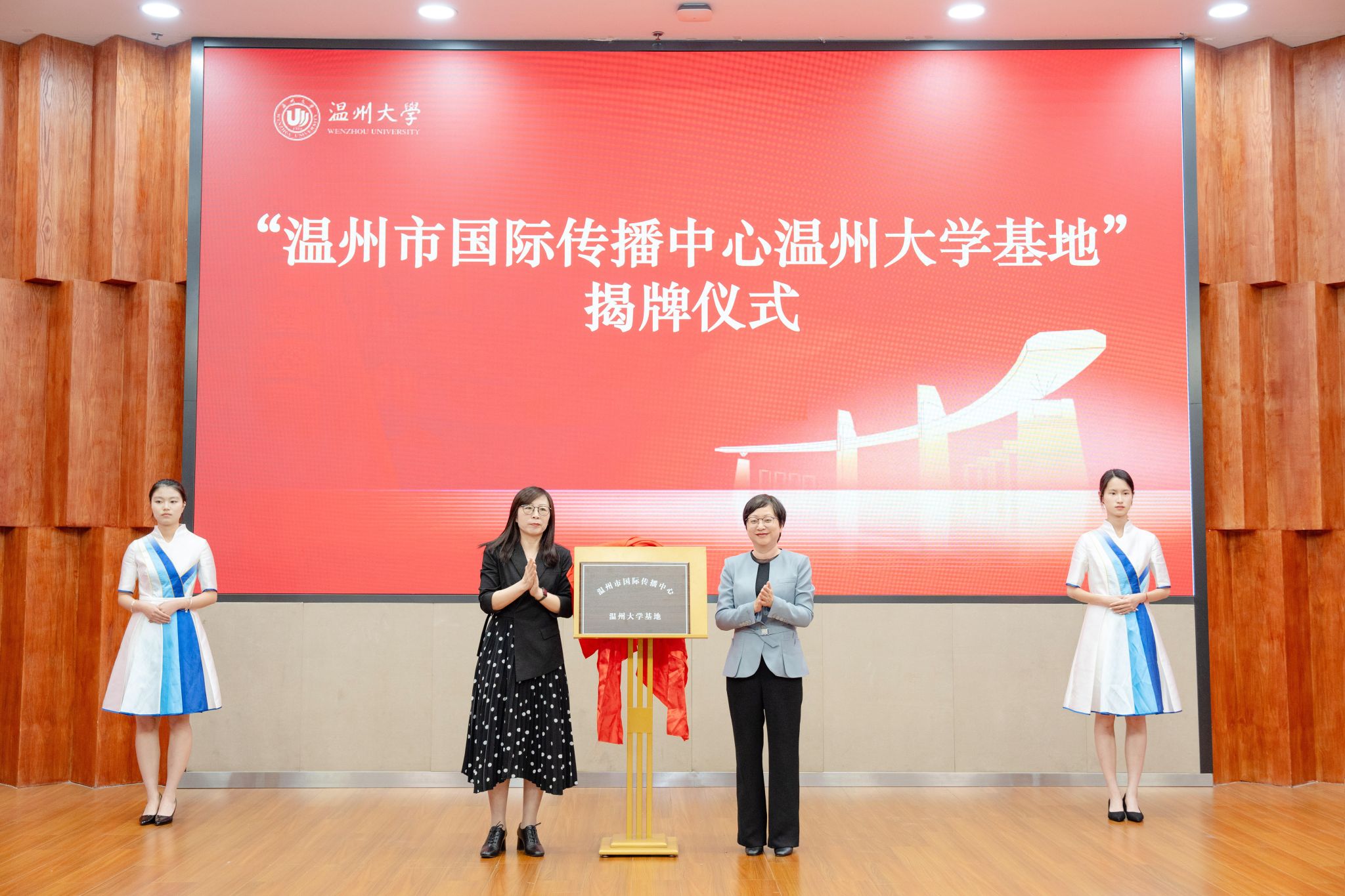 日本a片 党委委员、宣传部部长吴静与温州市委宣传部副部长陈靓秋共同为“温州市国际传播中心日本a片 基地”揭牌,该基地将整合校地优势资源,打造具有国际影响力的文化传播平台,助力温州城市形象的国际推广。