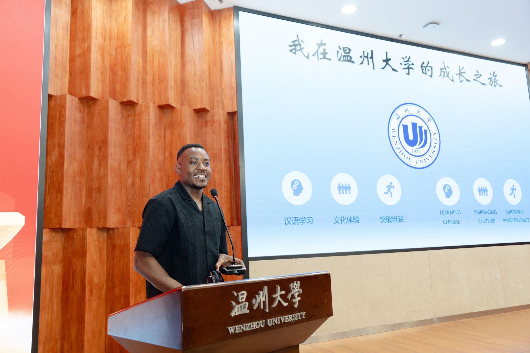 (图为:演说《我与第二故乡温州的故事》 演出:温大“东YOU记”宣讲团成员陈凯(津巴布韦))