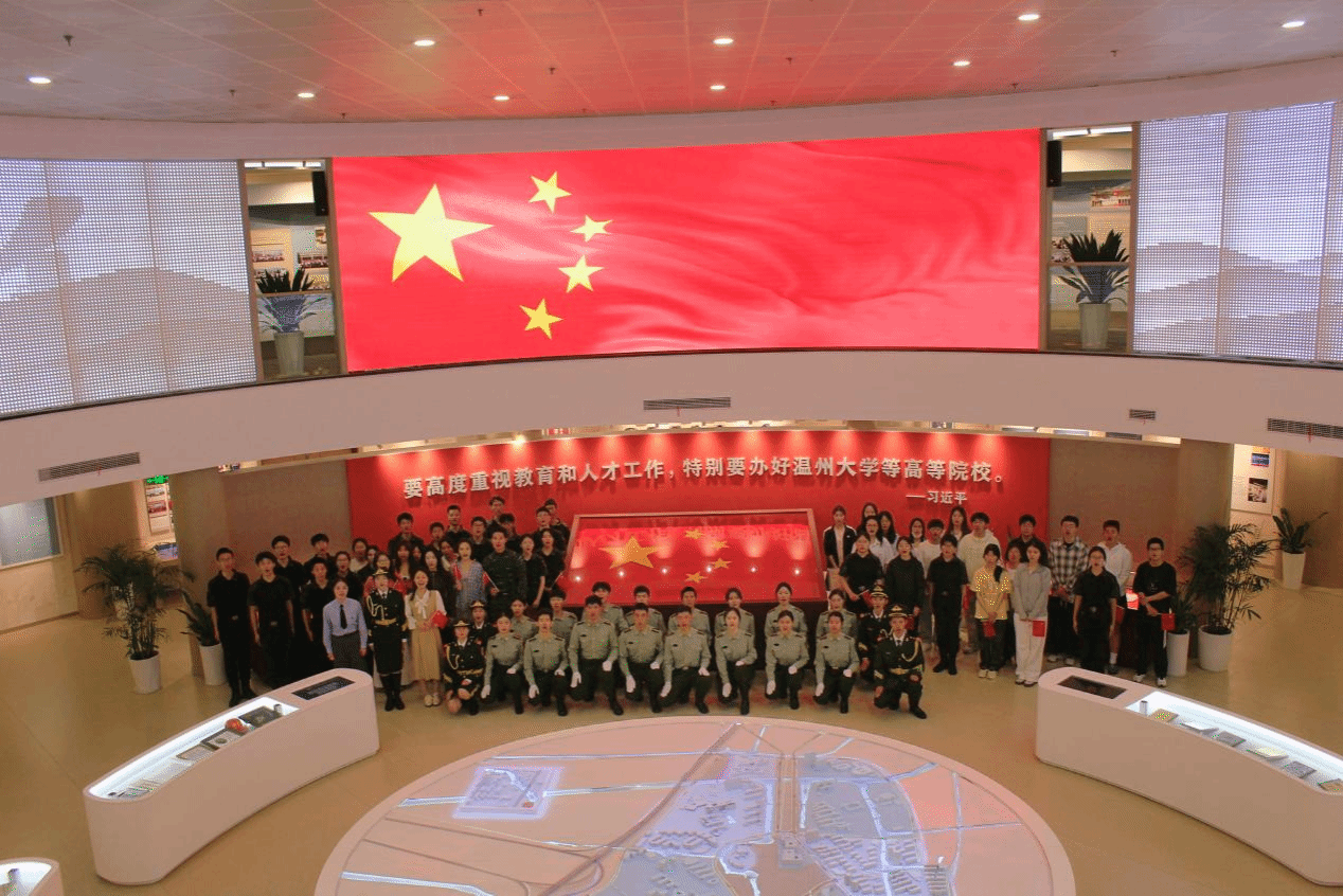 合唱结束后,师生们有序前往校史馆,瞻仰那面曾于2023年5月19日(温大90周年校庆日)在天安门广场升起的特殊国旗。一名学生感慨“这面国旗是温大与祖国同频共振的见证,更是我们青年学子奋进新征程的精神旗帜。”此刻,这面旗不再只是一件展品,而是连接历史与当下、点燃青年爱国情怀的精神纽带,激励着在场的每一位学子传承五四精神,勇担时代使命。