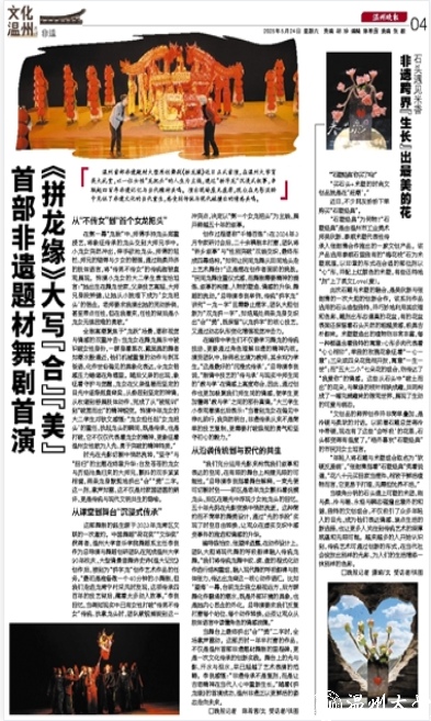 当舞台上最终拼出“合”“美”二字时,全场掌声雷动。这部历时一年半打磨的作品,不仅是温州首部非遗题材舞剧的里程碑,更是一次文化传承的创新实践。舞台上的光与影、汗水与泪水,早已超越了艺术表演的范畴。李良感慨:“非遗传承不是复刻,而是让古老精神在当代人心中重新生长。”随着《拼龙缘》的首演成功,温州非遗正以更鲜活的姿态走向未来。