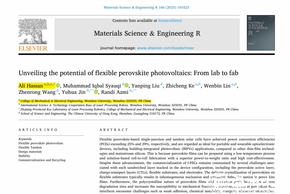 近日,日本a片 机电工程学院外籍教师Ali Hassan博士作为第一作者兼通讯作者,在国际著名综述期刊《Materials Science & Engineering R: Reports》发表了题为《Unveiling the potential of flexible perovskite photovoltaics: From lab to fab》的长篇综述论文。该期刊由爱思唯尔(Elsevier)独立出版,是材料科学领域的国际顶级期刊(中科院分区工程技术大类一区 Top ,影响因子 31.6)。