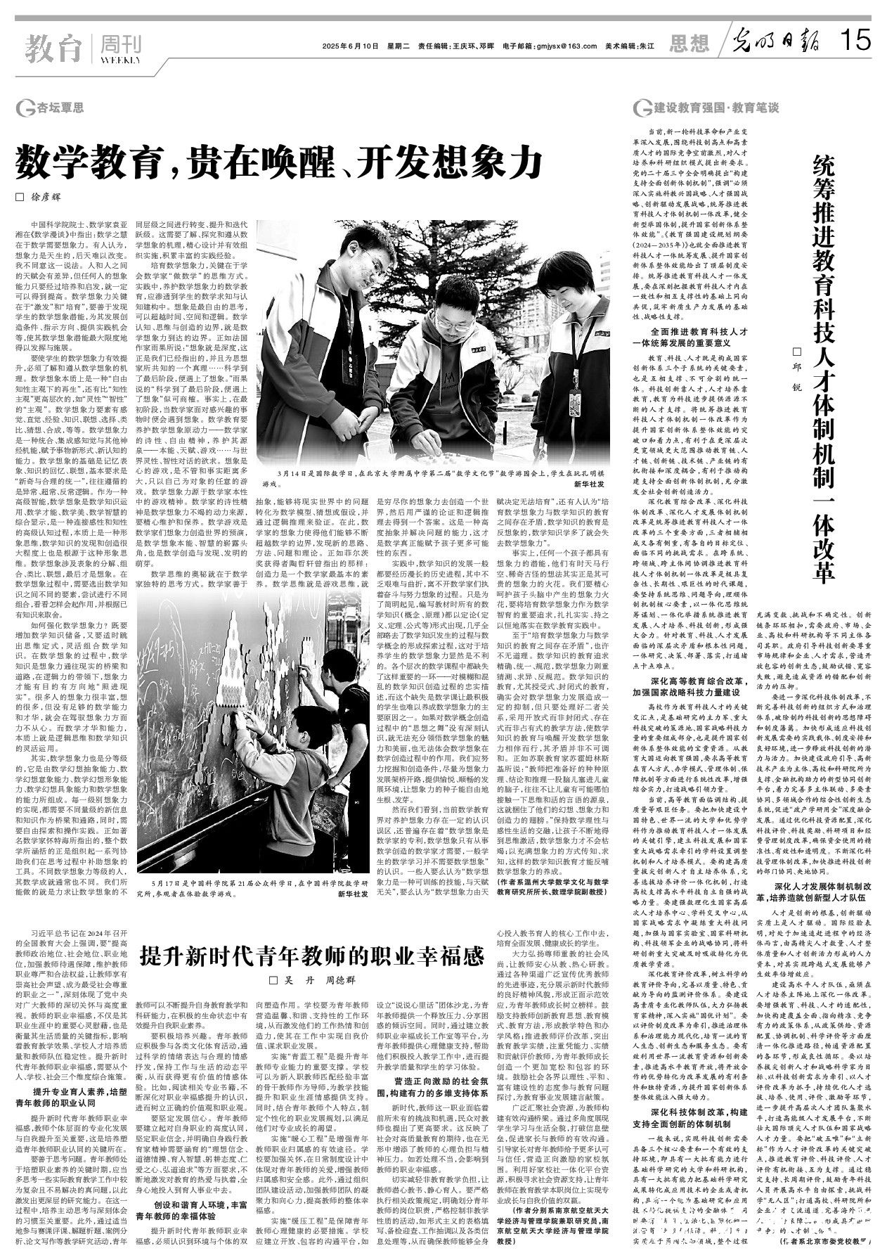 中国科学院院士、数学家袁亚湘在《数学漫谈》中指出:数学之慧在于数学需要想象力。有人认为,想象力是天生的,后天难以改变。我不同意这一说法。人和人之间的天赋会有差异,但任何人的想象能力只要经过培养和启发,就一定可以得到提高。数学想象力关键在于“激发”和“培育”,要善于发现学生的数学想象潜能,为其发展创造条件、指示方向、提供实践机会等,使其数学想象潜能最大限度地得以发挥与施展。