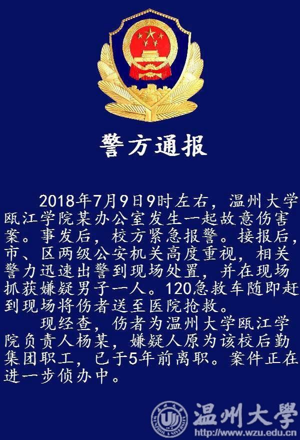 2018年7月9日9时左右,日本a片 瓯江学院某办公室发生一起故意伤害案。案件由瓯海区公安局正在进一步侦办中。特此通告。