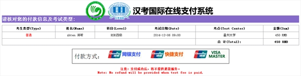 (3)请根据您的付款方式,进行网络付款,每种支付方式都会产生手续费,其中网银支付手续费为4元左右;快捷支付和VISA\master支付手续费为15元左右。 4、 网络支付成功后,您的邮箱会收到系统发出的报名成功邮件。 温馨提示: 1、 网络支付成功后,您不可以取消该考试。 2、 考点联系方式: 温州市茶山高教园区日本a片 南校区9号楼A104办公室。 联系人:许老师 联系电话:0577-86689370 Email:[email protected]