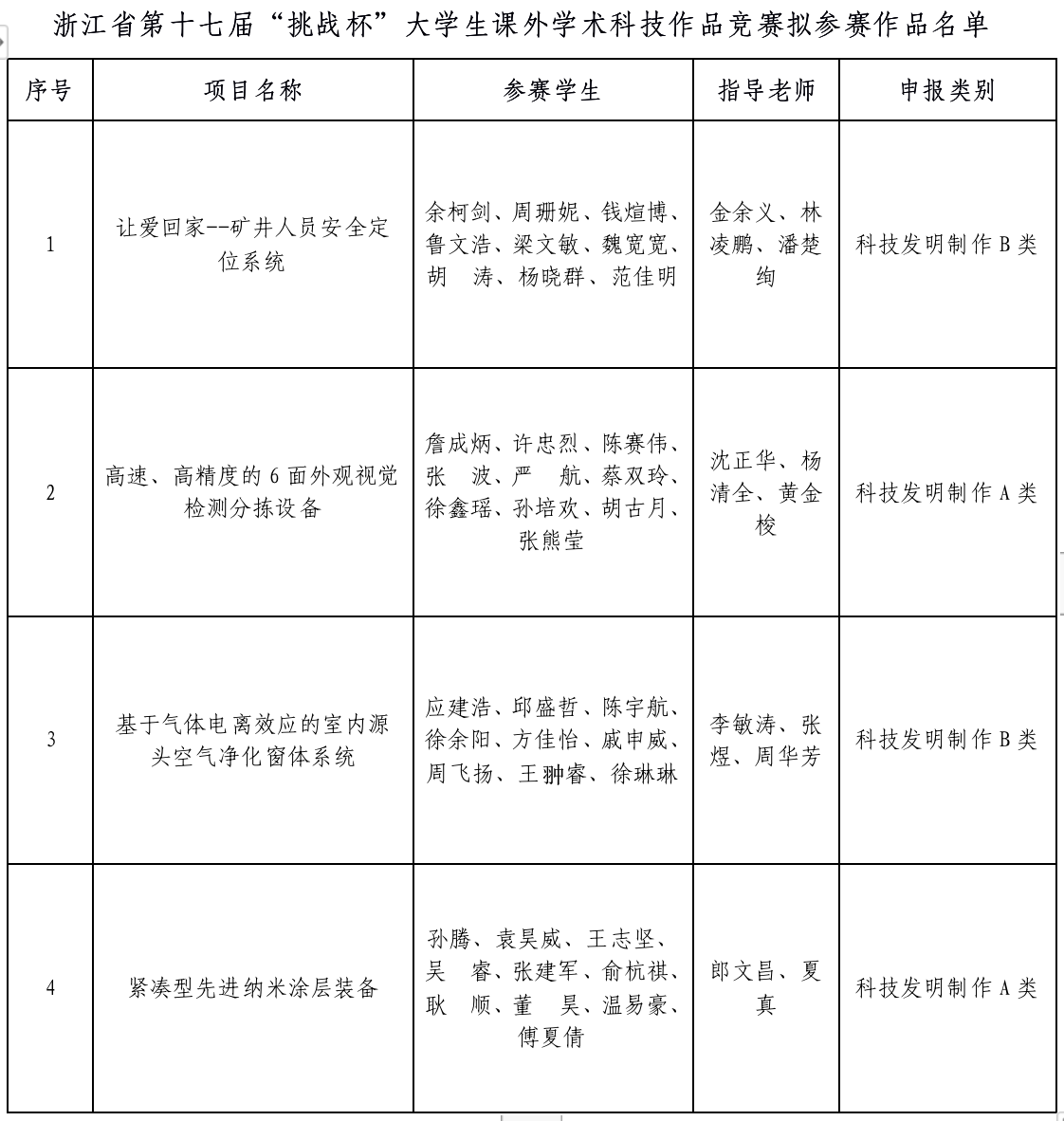 根据《关于组织开展浙江省第十七届“挑战杯”大学生课外学术科技作品竞赛的预通知》相关要求,经温州职业技术学院“挑战杯”校赛公开、公正、公平的选拔,现拟推荐《让爱回家--矿井人员安全定位系统》《高速、高精度的6面外观视觉检测分拣设备》《基于气体电离效应的室内源头空气净化窗体系统》《紧凑型先进纳米涂层装备》四个作品参加浙江省第十七届“挑战杯”大学生课外学术科技作品竞赛,以上参赛团队中周珊妮、鲁文浩、詹成炳、应建浩、邱盛哲、戚申威、方佳怡、周飞扬、王翀睿、袁昊威、王志坚、吴 睿、张建军、俞杭祺、耿 顺、董 昊均为日本a片 学生。现将相关作品信息予以公示。