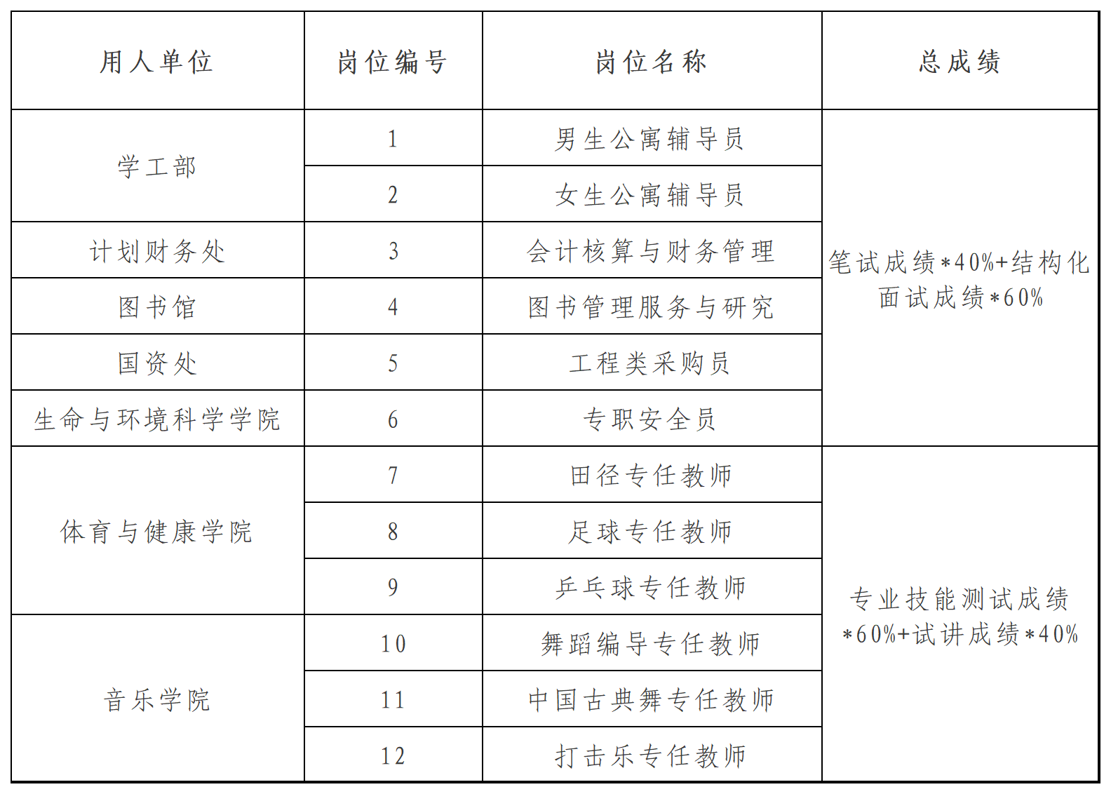 编号1、2、3、4、5、6岗位复试采用结构化面试的方式;编号7、8、9、10、11、12岗位复试采用试讲的方式。复试成绩采用百分制,满分为100分,合格分为70分。复试成绩低于70分者,不能列为体检、考察对象。