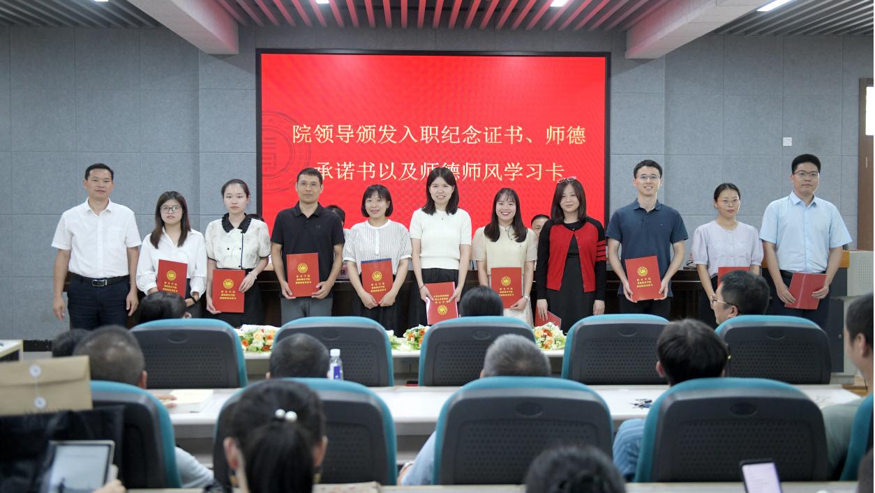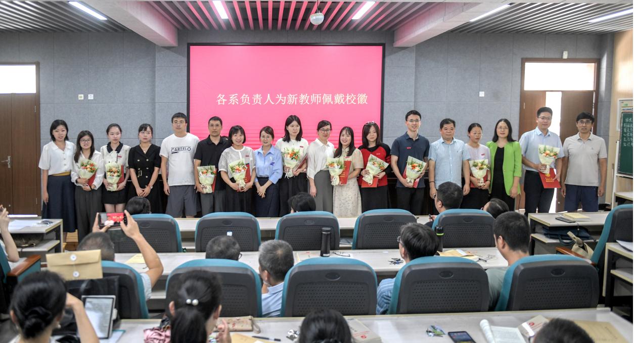 随后,学院举行新教师入职仪式。何书记为毛鹏程等11位新入职教师颁发入职纪念证书、教师师德承诺书、师德师风建设制度摘要等,并合影留念。各系、科室负责人为新教师佩戴校徽,送上鲜花,表达对新入职老师的热烈欢迎和殷切期望。入职仪式后,全体教师起立,进行教师宣誓仪式,重温教师誓词。