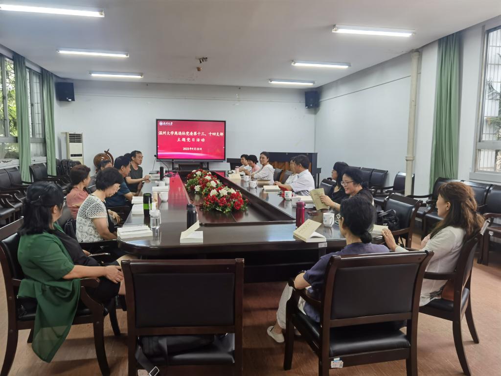 2023年9月23日上午,温大离退休第十三、十四党支部在学院路校区老干部活动中心联合举办“不忘初心、牢记使命,喜迎亚运、庆祝国庆”主题党日活动。两个支部召开学习贯彻习近平新时代中国特色社会主义思想主题教育理论学习会,并以乒乓友谊赛的形式喜迎亚运、庆祝国庆。活动由离退休第十三党支部书记周青萍主持。