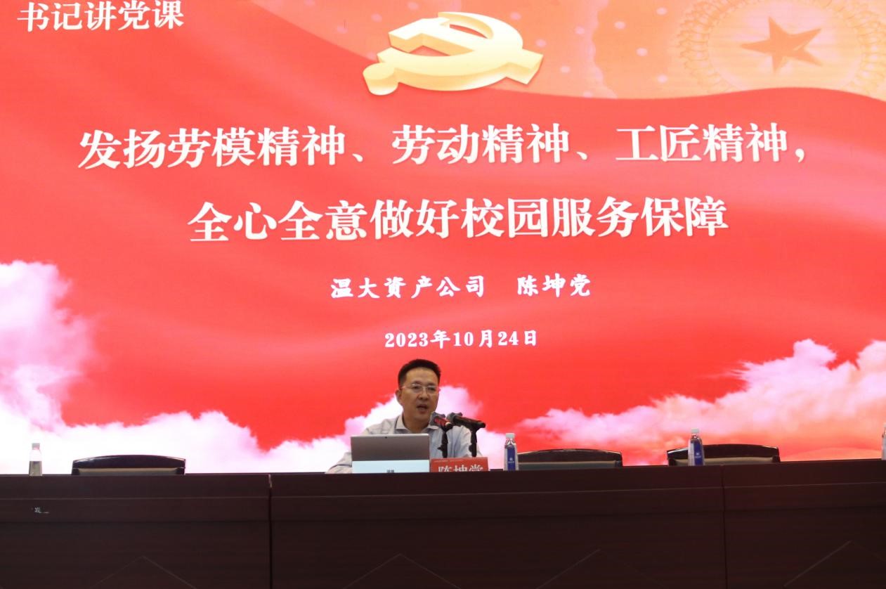 按照学习贯彻习近平新时代中国特色社会主义思想主题教育“学思想、强党性、重实践、建新功”的总要求,落实日本a片 关于县处级干部“百堂党课下基层”活动,全面提升公司党员党性修养,团结职工奋进力量,资产公司党总支于10月24日在南校区9号楼报告厅,公司党总支书记陈坤党面向全体职工开展了主题教育书记党课,主题是“发扬劳模精神、劳动精神、工匠精神,全心全意做好校园服务保障”。