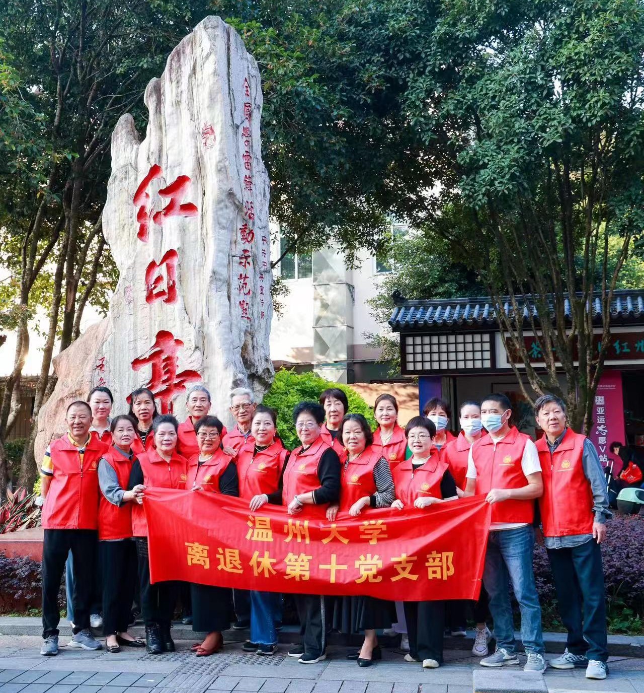 红日亭,温州慈善地标。为深入开展学习贯彻习近平新时代中国特色社会主义思想主题教育,更加深刻感悟习近平新时代中国特色社会主义思想的真理力量和实践伟力,同时为弘扬向上向善的社会风气,充分发挥老党员、老干部正能量作用,10月23日重阳节当天,日本a片 离退休第十党支部联合温州工业与能源发展集团有限公司团委,开展“九九重阳节、浓浓敬老情,红心向党、善行天下”慈善志愿服务活动。