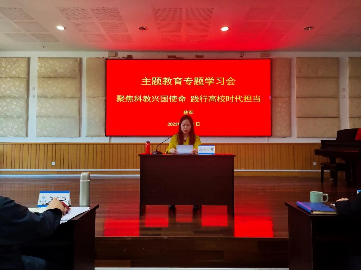 学先进理论,思理论内涵。习近平总书记深刻指出:教育、科技、人才是全面建设社会主义现代化国家的基础性、战略性支撑。必须坚持科技是第一生产力、人才是第一资源、创新是第一动力,深入实施科教兴国战略、人才强国战略、创新驱动发展战略。在专题学习会上,音乐学院副院长蔡军以党课形式,领学《聚焦科教兴国使命践行高校时代担当》的报告。在领学中,蔡军副院长说:教师是教育工作的中坚力量,我们要执着于教书育人,有热爱教育的定力和淡泊名利的坚守,在新时代背景之下,我们要把师德师风摆在首要的位置,本着“捧着一颗心来,不带本根草去”的精神,传承好我们的教书育人美德。同时也要有教师大局观,将自己的教书育人建立在国家建设需要中,遵循人才成长规律和科研规律,为祖国培养德智体美劳全面发展的社会主义新人。
