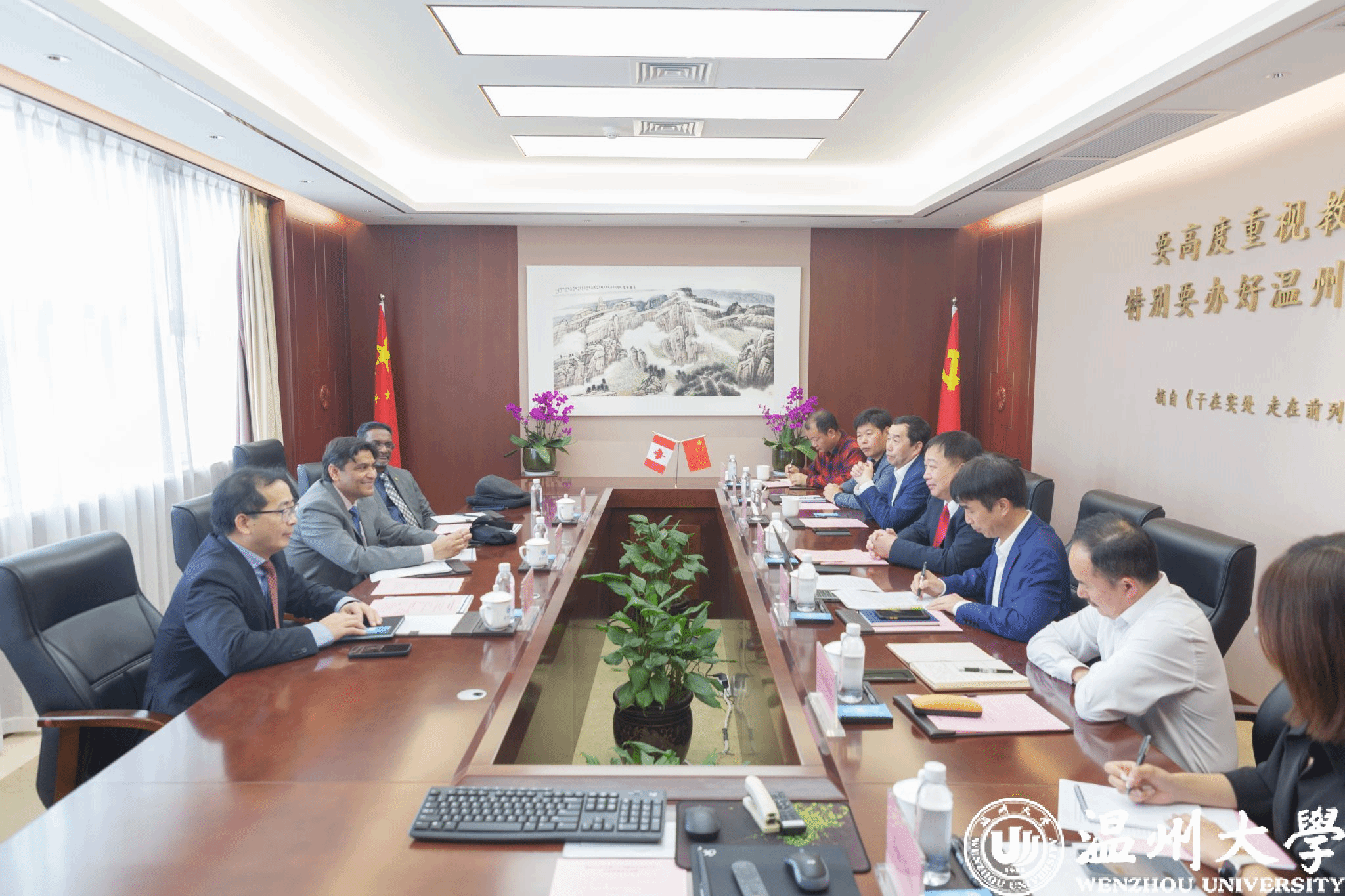 On the morning of April 3rd, Wenzhou University held a cooperation negotiation meeting with the University of British Columbia (UBC) from Canada. ZHAO Min, President of Wenzhou University, and Dr. Rehan Sadiq, Vice President and Provost of UBC, along with Professor Kasun Hewage from UBC and Professor Jianbing LI from the University of Northern British Columbia, attended the meeting, alongside representatives from the International Relations Office and the College of Life and Environmental Science, as well as faculty representatives.
