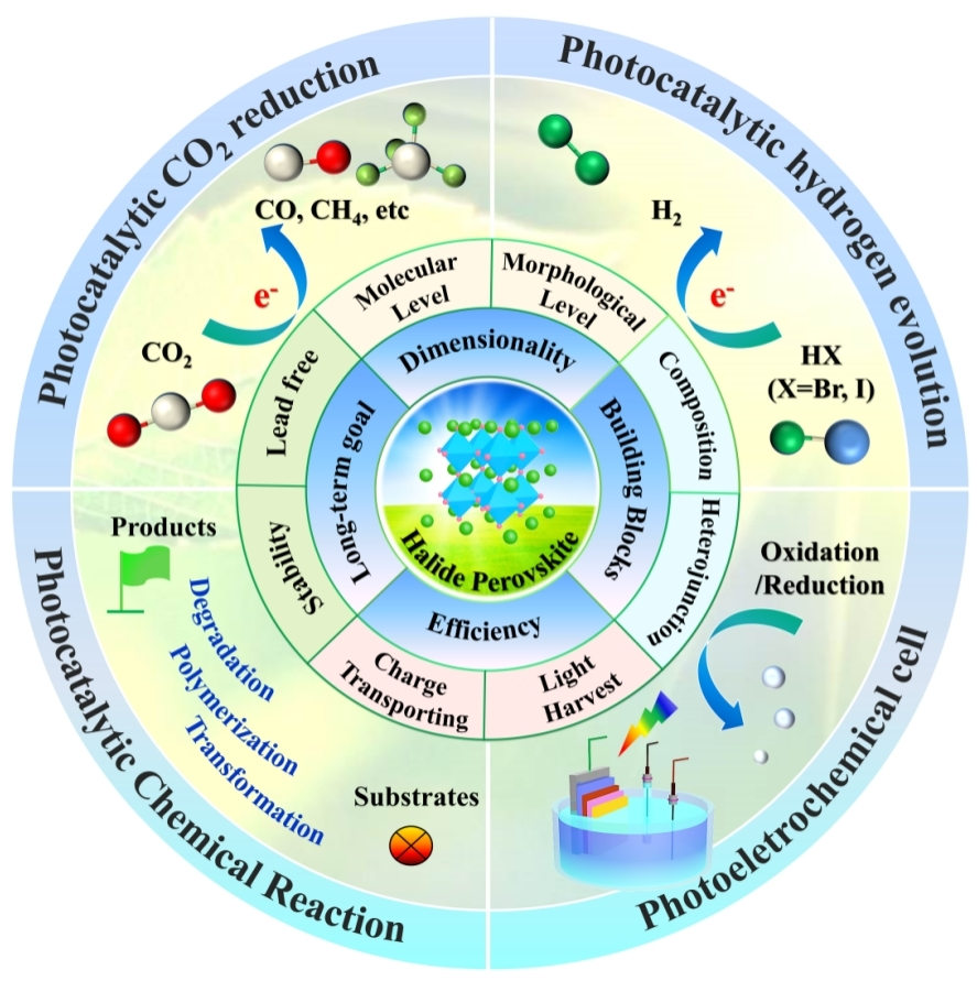 This review article summarizes the development of metal halide perovskite materials in recent years, such as their dimensionality, synthesis, and heterojunction structure, and systematically analyzes the applications of perovskite materials in the fields of photocatalytic chemical conversion, carbon dioxide reduction, hydrogen production and photoelectrocatalysis, and the prospects for the research on scientific issues such as the structure/dimension design, catalytic performance, and stability improvement of new perovskite materials. This review will provide a valuable reference for researchers engaged in metal halide perovskite photo (photoelectric) catalysis, and accelerate the development and application of a new generation of high-performance perovskite functional materials.