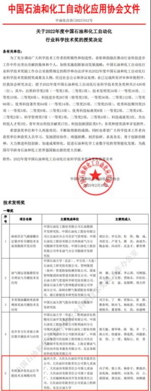 Recently, China National Association for Automation in Petroleum and Chemical Industry announced the winners for the 2022 China Petroleum and Chemical Automation Industry Science and Technology Awards. The project of "Optimization and Energy-saving Technology for Rod-pumped Wells and Its Scale Application", completed by Professor Feng Ziming, Professor Xiang Jiawei, and Associate Professor Huang Shenquan from the College of Mechanical & Electrical Engineering, with Wenzhou University as the first completion unit, was awarded the first prize for the 2022 Science and Technology Invention Award in petroleum and chemical automation industry.