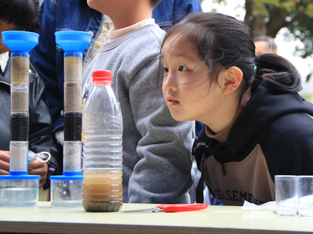 With the motif of “water conservation and recycling for all”, the beautiful posters fabricated by WZU students and teachers attracted many people passing by. At the event, children gazed in awe at the device that turned turbid water into clear water. “This small water purification device has four layers. The top two layers are mainly to filter the larger impurities while the bottom two layers are mainly to adsorb the fine floating ash. This is only a simple water purification device. To make the water drinkable, we have to filter it with other devices,” explained the volunteers to the children.