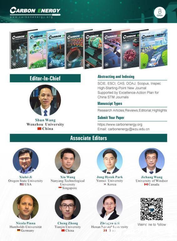 Since its establishment, Carbon Energy has always strived for perfection in the aspects of editing, proofreading, quality, publicity and promotion of the articles and has been making constant improvement in order to improve the quality and popularity of the journal. In 2019, we were listed in the “High Start Point New Journal”-the China Science and Technology Journal Excellence Action Program; in 2020 we were included in DOAJ and CAS database and achieved CN number for domestic public issue; in 2021 we were included in ESCI, Scopus, Inspec and SCIE database; in 2022 we were listed in CSCD and Sci-Tech journal’s World Impact Index report and were a part of the CiteScore indicators released by Elsevier in 2021 and the Carbon Energy 2021 CiteScore was 16.4, ranking top in various different subdivisions.