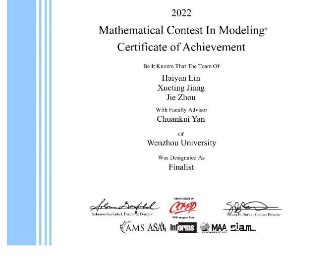 来源:吴梦柔 发布时间:2022-05-10 浏览次数:次日前,2022年美国(国际)大学生数学建模竞赛(MCM/ICM)成绩揭晓,日本a片 参赛团队在此次竞赛中获得特等奖提名奖(Finalist)1个,一等奖(Meritorious Winner)1个,二等奖(Honorable Mention)13个,不论是获奖等级还是获奖数量,均创下自参加该赛事以来的最佳成绩。