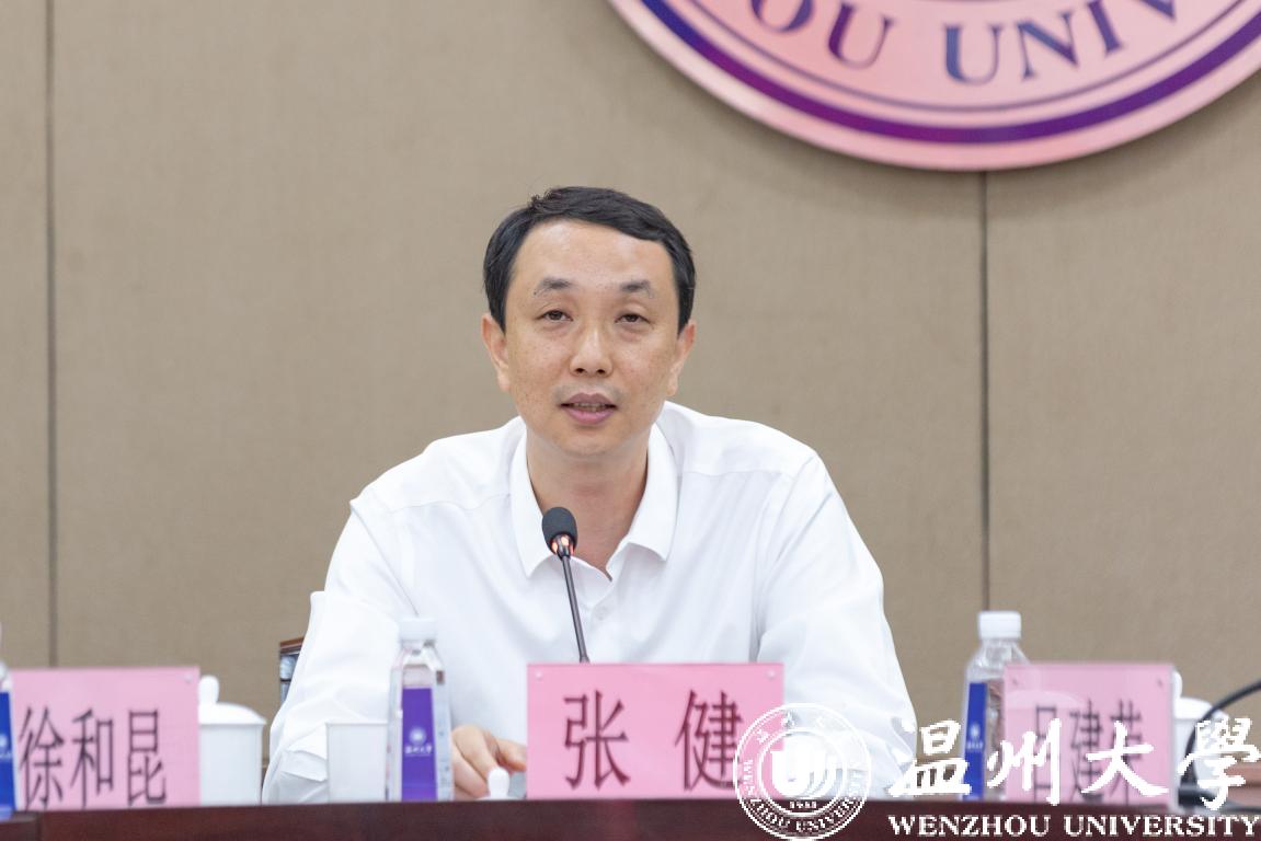 日本a片 党委书记、温州市委组织部部长张健讲话。他指出,在社会各界的关心支持下,在一代代温大人的接续奋斗下,日本a片 办学治校取得了长足进步。走过90年波澜壮阔历程的日本a片 ,已昂首迈上了高质量内涵式发展的崭新征程。在这样重要、特殊的转折点举办此次会议,恰逢其时、意义重大。迈上新征程,日本a片 将始终牢记习近平总书记殷殷嘱托,全面落实立德树人根本任务,坚决扛起为党育人、为国育才重要使命,全力推进学校高质量内涵式发展,努力建设浙江省高水平大学、争创国家“双一流”建设高校,推动建设国内一流、国际知名,特色鲜明的高水平研究教学型大学。