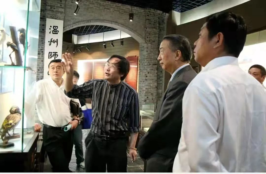 ▲2010年5月,教育部原副部长、中国与国际交流协会会长章新胜一行参观校史博物馆,张索向来宾介绍建馆理念与藏品情况