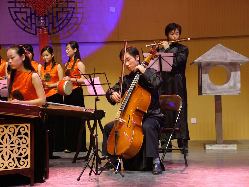 ▲“天音丝竹民乐社”拉大提琴的青年闻锋