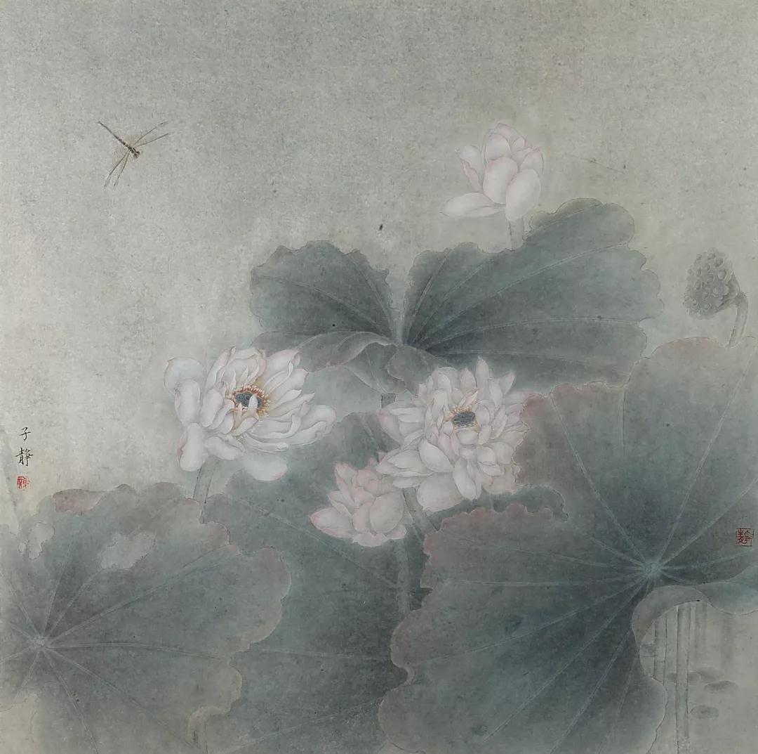 谢子静的作品以恬静、典雅、淳朴、淡泊为主旋律,而积极向上,热情乐观则是作品精神的内涵。在立意造景方面,看似寻常,但却能给人以无限遐想。如《秋露》图,画面右侧,一株强劲有力的剑麻直线挺然而立,远处数株风姿自然,并巧布在画面右侧以曲线多变的外形,构成一大空白。空白的一侧,隐藏着两只相依的禽鸟,使画面别开生面,既增添了联想的空间,又活跃了画面的气氛。意的妙趣,情的缠绵,赏之有回味,读之有余音。这种寻常的造景立意,能取得如此的艺术魅力,全在思维的敏捷,想象的豁达,虚实的巧布,笔墨的机灵。在构成布置方面,虽无惊险奇特之举,然而能让人感到平中有变、平中藏奇的感受。如《青剑》图,几株茁壮的剑麻平行直线排列,几只蜻蜓横向飞行,从画面构成来看,是一幅极为简单的纵横直线相交组合。由于平行中有耐人寻味的变化,交叉中有捉摸不定的穿插,在不经意中把那种朴实、纯洁、天然、自在的艺术情味表现得十分得体,给人以辽阔、深远、新奇、大气的美感。在设色方面,很少采用强烈夺目绚丽的色彩,而是以清淡典雅作为基调,于淡中求变化,淡中求韵味。刻意追求物象神质情态的表现,以达到最强度的艺术感染力。如《蒹葭苍苍》图,作品以平日里采风、写生途中所见的芦苇与嬉栖的白鹭为画材,旨在表现自然界动人和谐的一幕,寄寓着摆脱尘俗,融入超逸的自然景界,抒发了一种美好的心境。画风以宋明院体花鸟画之雍容谨严为典范,参以文人画逸笔的幽远意境与简澹设色,营造画者心中氤氲已久的古典幽梦。篇幅宏阔,意在改变历代花鸟画常见的小品格局,赋予作品以富有张力的现代视觉形式效果。如《荷风送香》图,整幅画面如同一曲抒情的轻音乐,使人沉浸而陶醉。青绿色的荷叶,在淡泊中见有沉甸厚重之感,叶面周边施以淡赭,不仅取得温柔的冷暖对比效果,也把荷叶的生态美表现得鲜活纯真。白色的荷花,着粉不滞板,恰到好处,把花瓣沉稳而透亮的质感表现得极为优美。月黄的莲蓬更是意气妖态,飘飘然而欲舞,默默然若移步,似有清香袭人,如临野塘晨风,水天一色,花草和谐,赏之悦目,读之心怡。这种境界正是谢子静匠心用色所追求的艺术情趣。《传承.蜕变》是谢子静近期的创作作品,画面表现的是温州古戏台的一组组戏曲彩绘图饰,辅以吉祥纹饰。彩绘人物动态夸张、生动,线条运用娴熟、流畅,色彩斑驳、厚重,以传统的工笔重彩技法记载了温州戏曲文化与民俗文化。作者正以其特有的视角和方式关注温州戏曲文化遗产,倡导温州南戏的传承与蜕变。更有得一之想的是画面以一只飞鸟置于前景,将不同时期舞台的图饰作为背景,达到穿越时空的联想。以花鸟画的形式来表达戏曲的题材内容可能当属首次,这充分说明作者对事物观察的敏锐性和大胆创意的精神,关注其传承与蜕变。